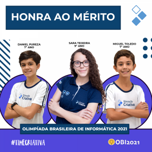 O brilhante resultado conquistado na Olimpíada Brasileira de Informática (OBI), é motivo de imensa alegria e de celebração para a Educação Criativa. Tratamos essa modalidade olímpica de forma estratégica, por envolver um relevante desafio para o desenvolvimento do raciocínio lógico, da engenhosidade, além de ser uma excelente oportunidade para vivenciar uma competição saudável. Ressaltamos, que a organização da OBI está a cargo do Instituto de Computação da UNICAMP.
