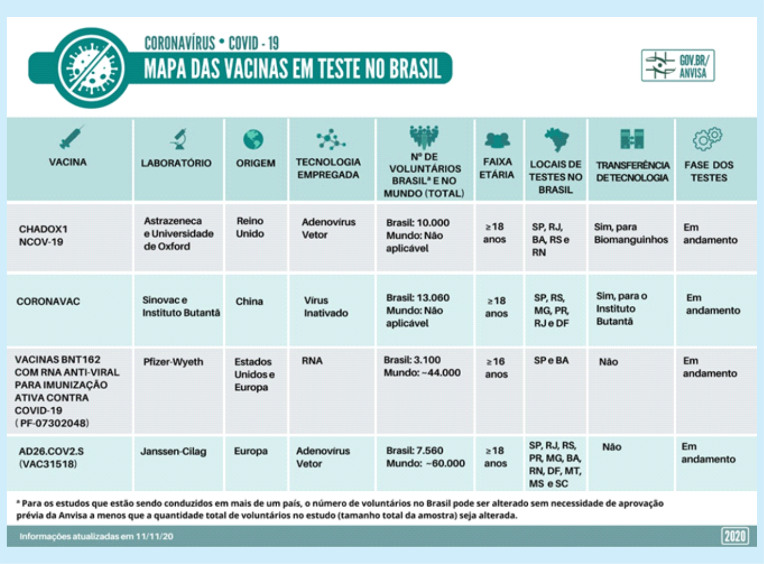 Segundo informações oficiais da Agência Nacional de Vigilância Sanitária – Anvisa (última consulta feita em 27/11/2020), há quatro vacinas em teste no país atualmente.